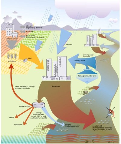 § Die wertvollen, in den menschlichen Ausscheidungen und im Abwasser enthaltenen Nährstoffe (Stickstoff, Phosphor und andere Elemente) werden in konventionellen Kläranlagen mit hohem technischen und energetischem Aufwand "eliminiert", d.h. tatsächlich vernichtet oder unproduktiv an die Gewässer abgegeben.